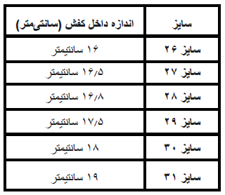 جدول راهنمای سایز (اندازه داخل نیم بوت دخترانه مدل نازلی)