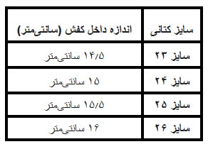نکته: همیشه پیشنهاد می‌شود حدود 0.5 سانتی‌متر فضای آزاد برای حرکت انگشتان و رشد پا در نظر بگیرید.